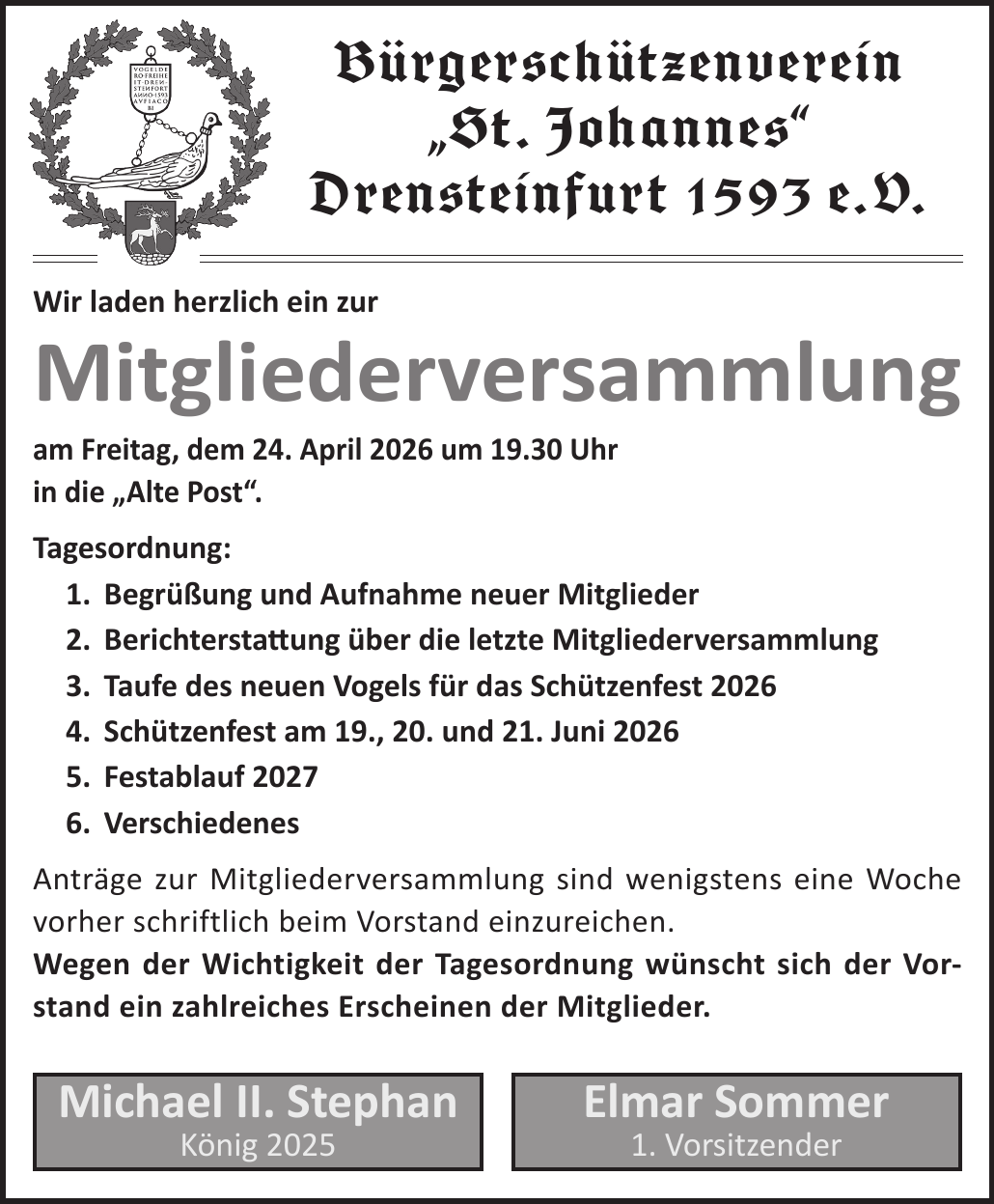 am Freitag, den 24.04.2026, fand zum ersten Mal in der Alten Post unsere Mitgliederversammlung statt – der Saal war gut gefüllt und die Stimmung durchweg positiv.