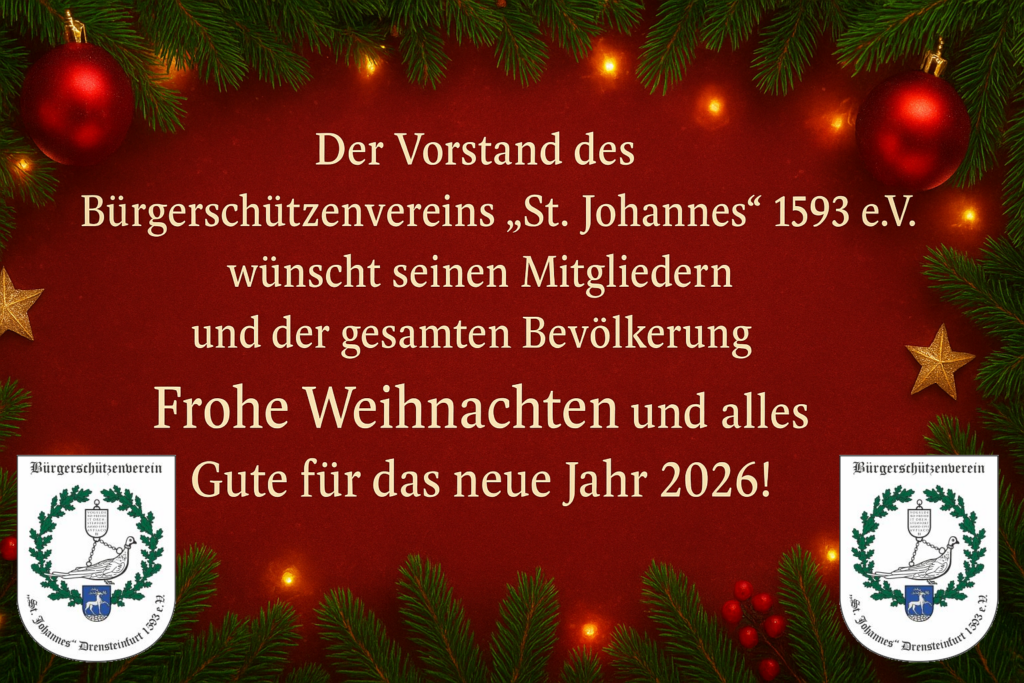 Der Bürgerschützenverein „St. Johannes“ 1593 e.V. begrüßt Sie herzlichst auf seiner Homepage. Wir laden Sie ein, sich über unseren Verein zu informieren, Neuigkeiten nebst Terminen zu erfahren oder einfach nur in unseren Archiven und Chroniken zu stöbern. Wir würden uns freuen, wenn wir Sie dann auch persönlich auf einer unserer Veranstaltungen begrüßen dürfen.