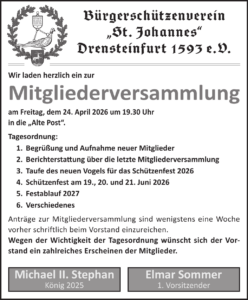 Der König und der Vorstand laden zur nächsten Mitgliederversammlung am 24.04.2026 in die Alte Post ein.